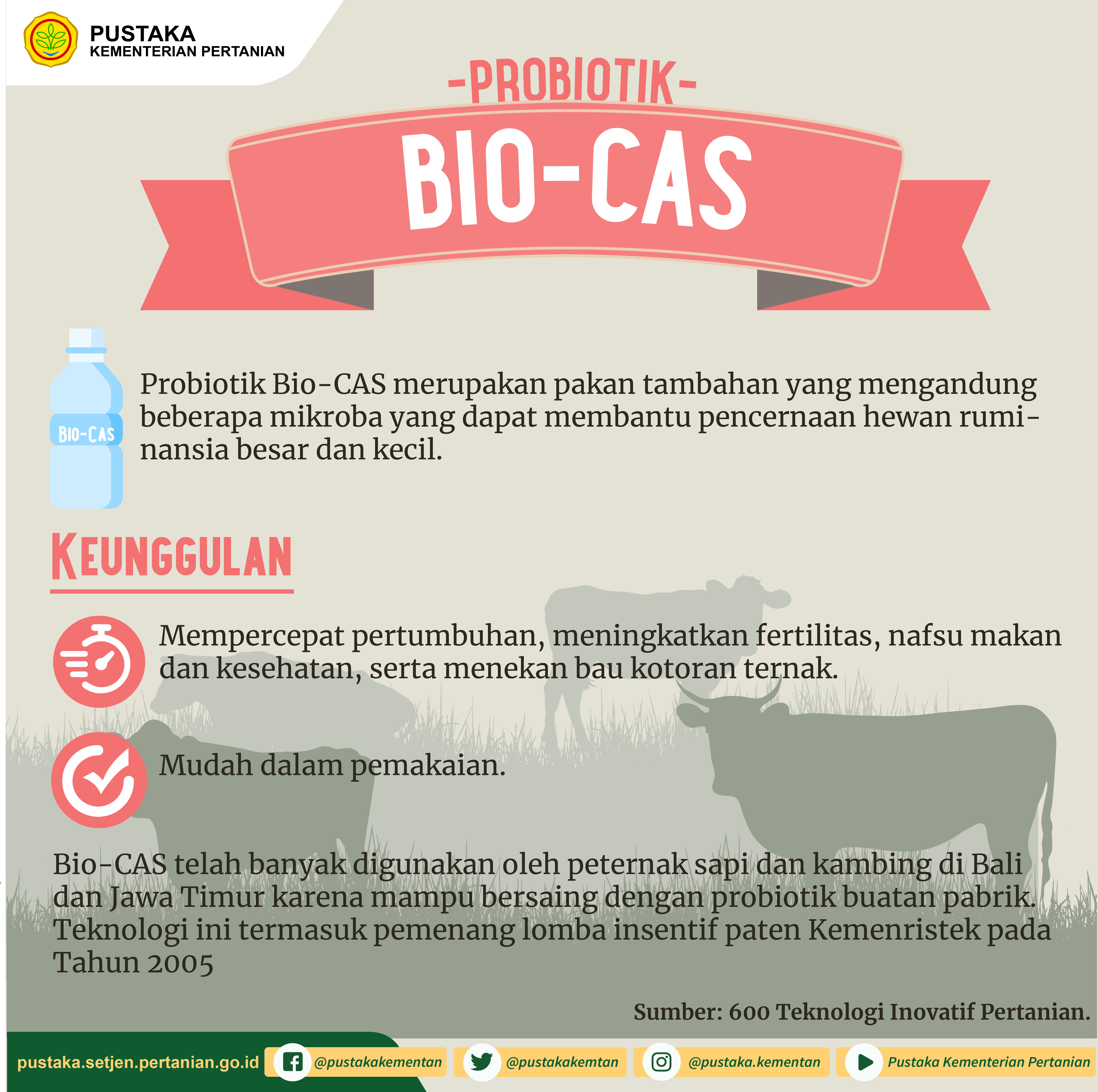 Probiotik Bio-CAS merupakan pakan tambahan yang mengandung beberapa mikroba yang dapat membantu pencernaan hewan ruminansia besar dan kecil.