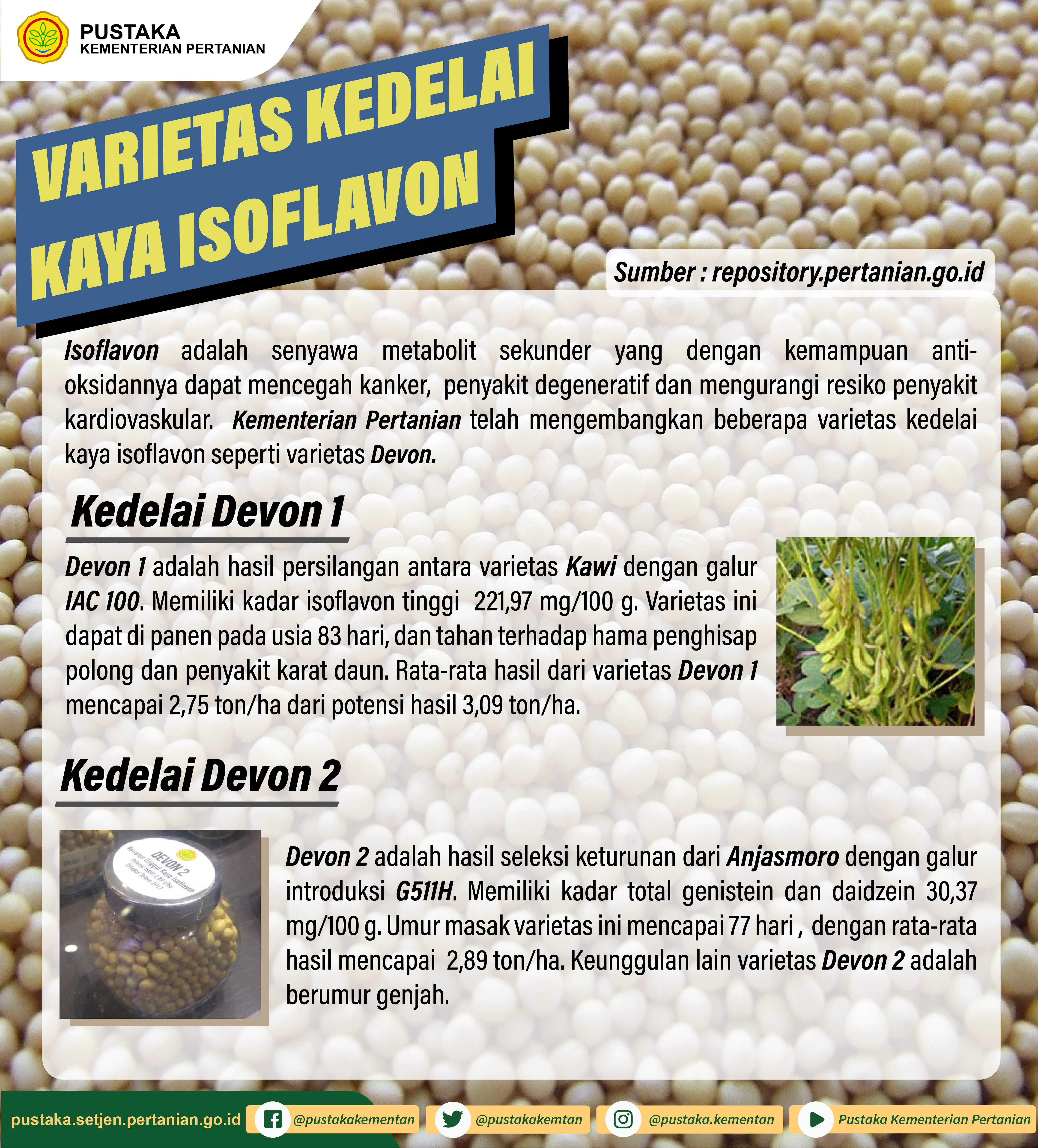 Kementerian Pertanian telah mengembangkan beberapa verietas kedelai kaya isoflavon seperti varietas devon