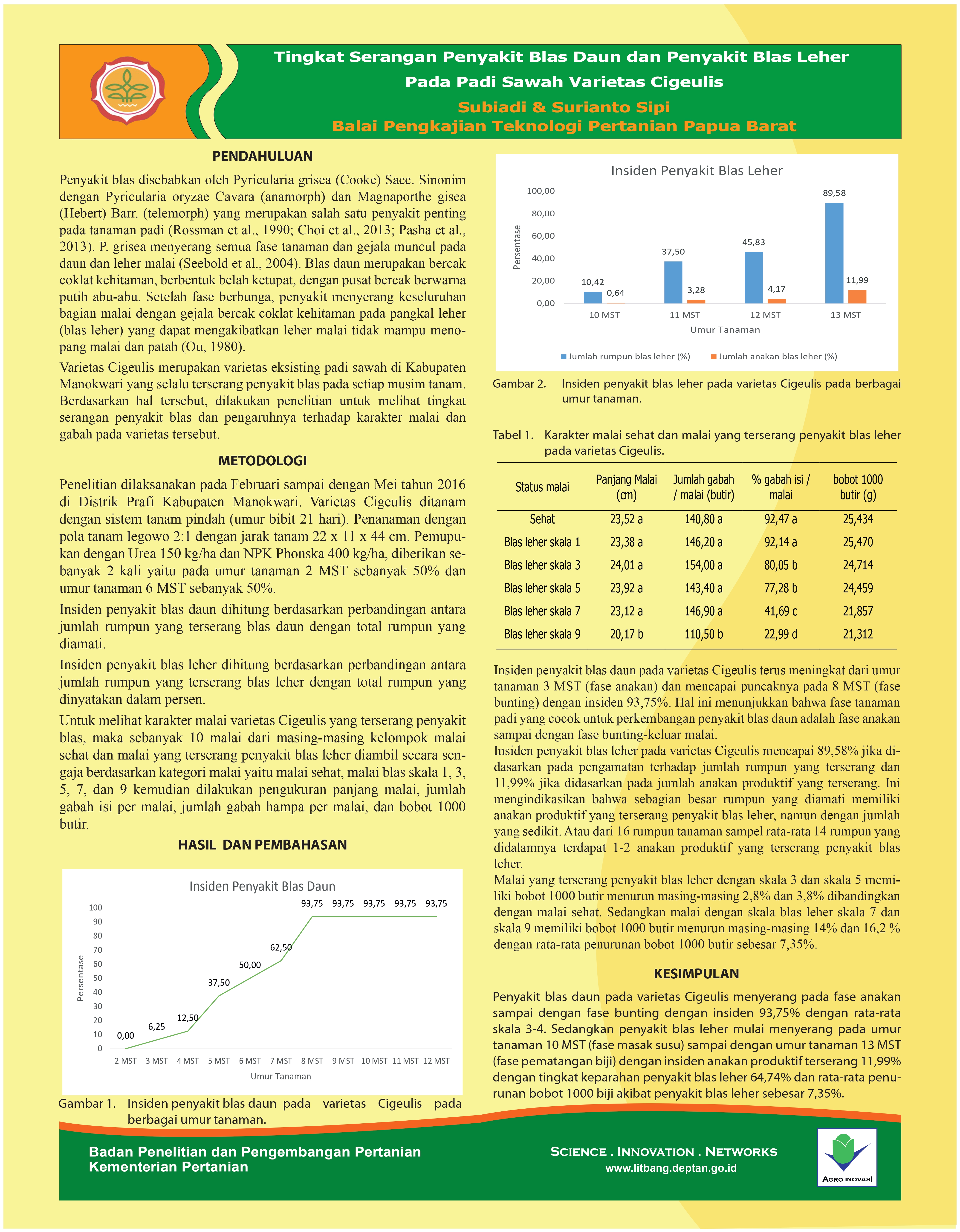 Varietas Cigeulis merupakan varietas eksisting padi sawah di Kabupaten Manokwari yang selalu terserang penyakit blas pada setiap musim tanam. Berdasarkan hal tersebut, dilakukan penelitian untuk melihat tingkat serangan penyakit blas dan pengaruhnya terhadap karakter malai dan gabah pada varietas tersebut. Varietas Cigeulis ditanam dengan sistem tanam pindah (umur bibit 21 hari). Penanaman dengan pola tanam legowo 2:1 dengan jarak tanam 22 x 11 x 44 cm. Pemupukan dengan Urea 150 kg/ha dan NPK Phonska 400 kg/ha, diberikan sebanyak 2 kali yaitu pada umur tanaman 2 MST sebanyak 50% dan umur tanaman 6 MST sebanyak 50%. Untuk melihat pengaruh penyakit blas terhadap varietas Cigeulis dilakukan pengamatan terhadap insiden dan skala penyakit blas daun, insiden dan keparahan penyakit blas leher, dan karakter malai dari malai sehat dan malai yang terserang penyakit blas leher. Hasil penelitian menunjukkan bahwa Penyakit blas daun pada varietas Cigeulis menyerang pada fase anakan sampai dengan fase bunting dengan insiden 93,75% dengan rata-rata skala 3-4. Sedangkan penyakit blas leher mulai menyerang pada fase masak susu sampai dengan fase pematangan biji dengan insiden anakan produktif terserang 11,99% dengan tingkat keparahan penyakit blas leher 64,74% dan rata-rata penurunan bobot 1000 biji akibat penyakit blas leher sebesar 7,35%.
