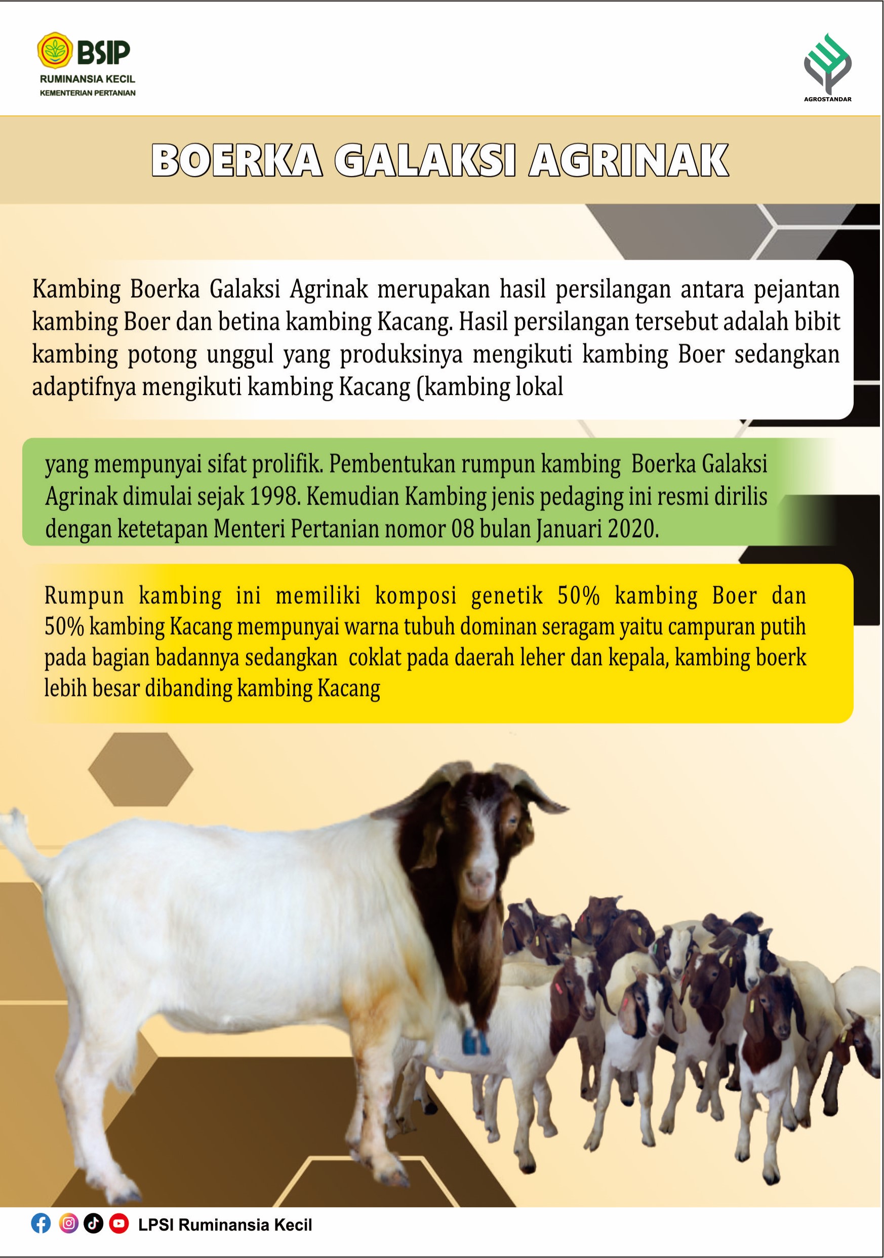 Kambing Boerka Galaksi Agrinak merupakan hasil persilangan antara pejantan kambing boer dan betina kambing Kacang. Hasil persilangan tersebut adalah bibit kambing potong unggul yang produksinya mengikuti kambing Boer sedangkan adaptifnya mengikuti kambing Kacang (kambing lokal) yang mempunyai sifat prolifik. Pembentukan rumpun kambing Boerka Galaksi Agrinak dimulai sejak 1998. Kemudian kambing jenis pedaging ini resmi dirilis dengan ketetapan Menteri Pertanian nomor 08 bulan Januari 2020.