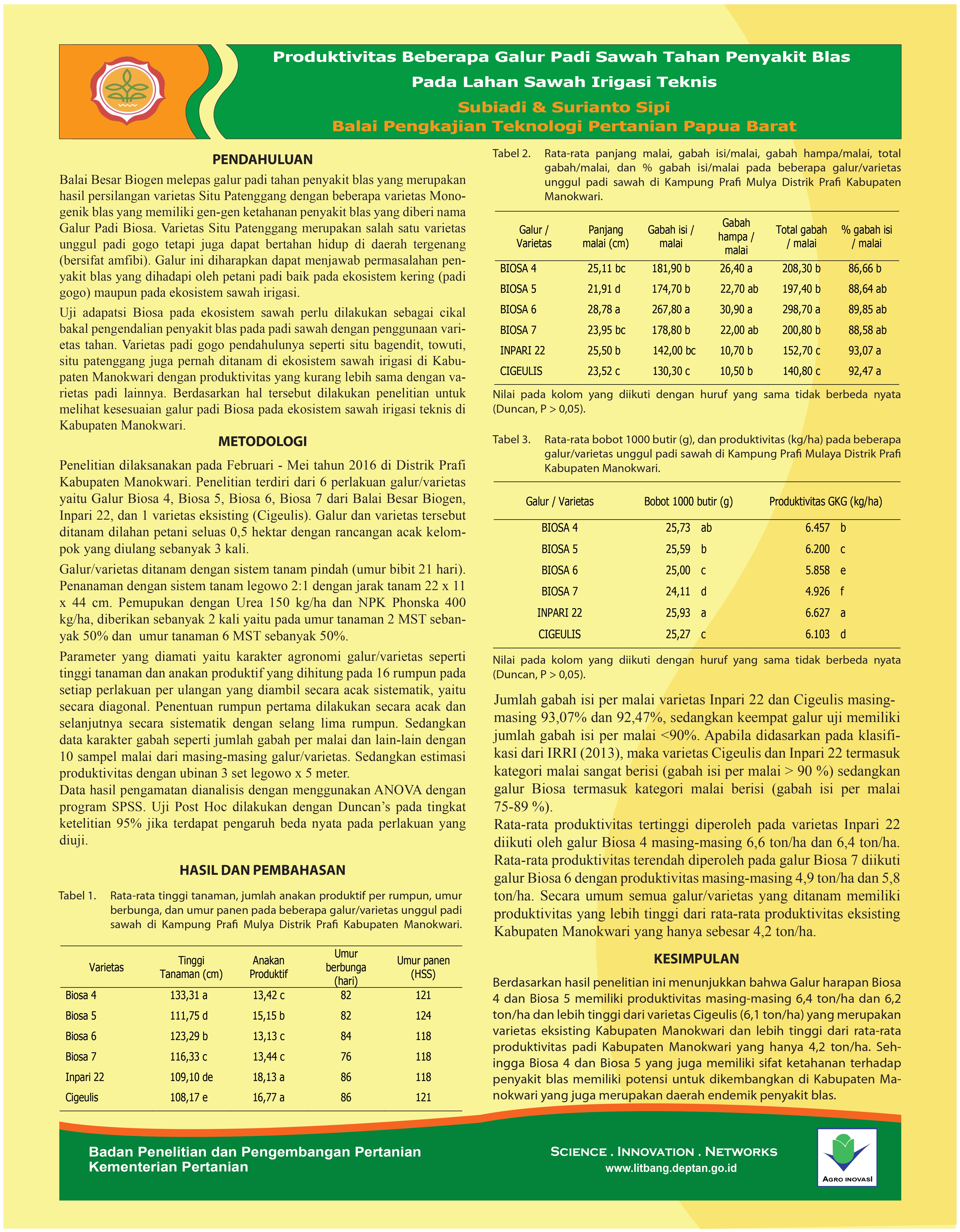 Balai Besar Biogen melepas galur padi tahan penyakit blas yang merupakan hasil persilangan varietas Situ Patenggang dengan beberapa varietas Monogenik blas yang memiliki gen-gen ketahanan penyakit blas yang diberi nama Galur Padi Biosa. Galur ini diharapkan dapat menjawab permasalahan penyakit blas yang dihadapi oleh petani padi baik pada ekosistem kering (padi gogo) maupun pada ekosistem sawah irigasi. Berdasarkan hal tersebut dilakukan penelitian untuk melihat produktivitas varietas Biosa pada ekosistem sawah irigasi di Kabupaten Manokwari. Penelitian dilaksanakan dengan metode demo plot di Distrik Prafi Kabupaten Manokwari. Galur/varietas yang digunakan sebanyak 6 varietas/galur yaitu Galur Biosa 4, Biosa 5, Biosa 6, Biosa 7 dari Balai Besar Biogen, Inpari 22, dan 1 varietas eksisting (Cigeulis). Galur dan varietas tersebut ditanam dilahan petani seluas 0,5 hektar dengan rancangan acak kelompok yang diulang sebanyak 3 kali. Berdasarkan hasil penelitian ini menunjukkan bahwa Galur harapan Biosa 4 dan Biosa 5 memiliki produktivitas masing-masing 6,4 ton/ha dan 6,2 ton/ha dan lebih tinggi dari varietas Cigeulis (6,1 ton/ha) yang merupakan varietas eksisting Kabupaten Manokwari dan lebih tinggi dari rata-rata produksi Kabupaten Manokwari yang hanya 4,2 ton/ha.