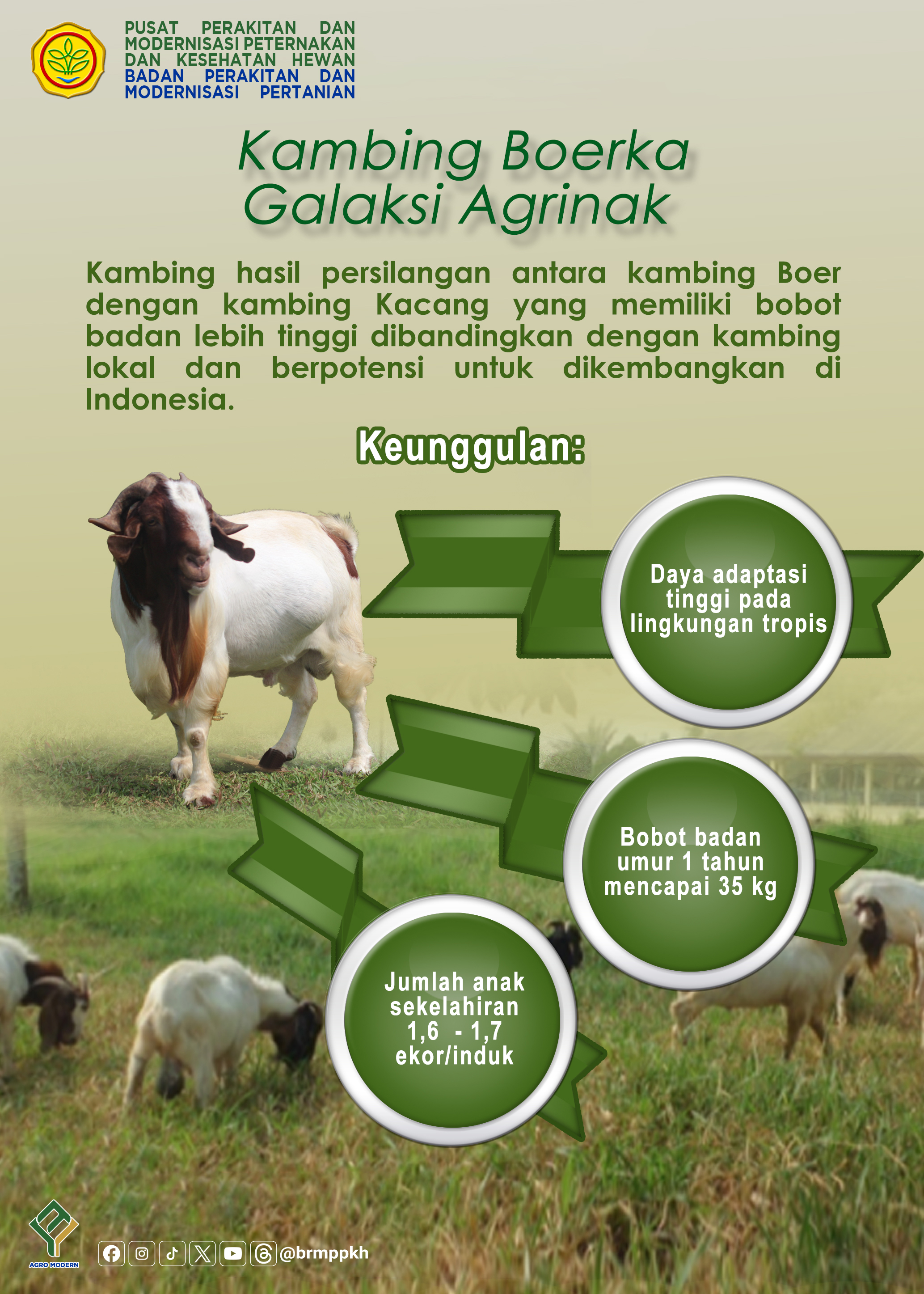 Kambing Boerka Galaksi Agrinak merupakan hasil persilangan antara kambing Boer dan kambing Kacang yang dirancang untuk menghasilkan ternak unggul dengan performa lebih baik dibanding kambing lokal. Kambing ini memiliki potensi besar untuk dikembangkan di Indonesia karena mampu beradaptasi dengan baik pada lingkungan tropis.