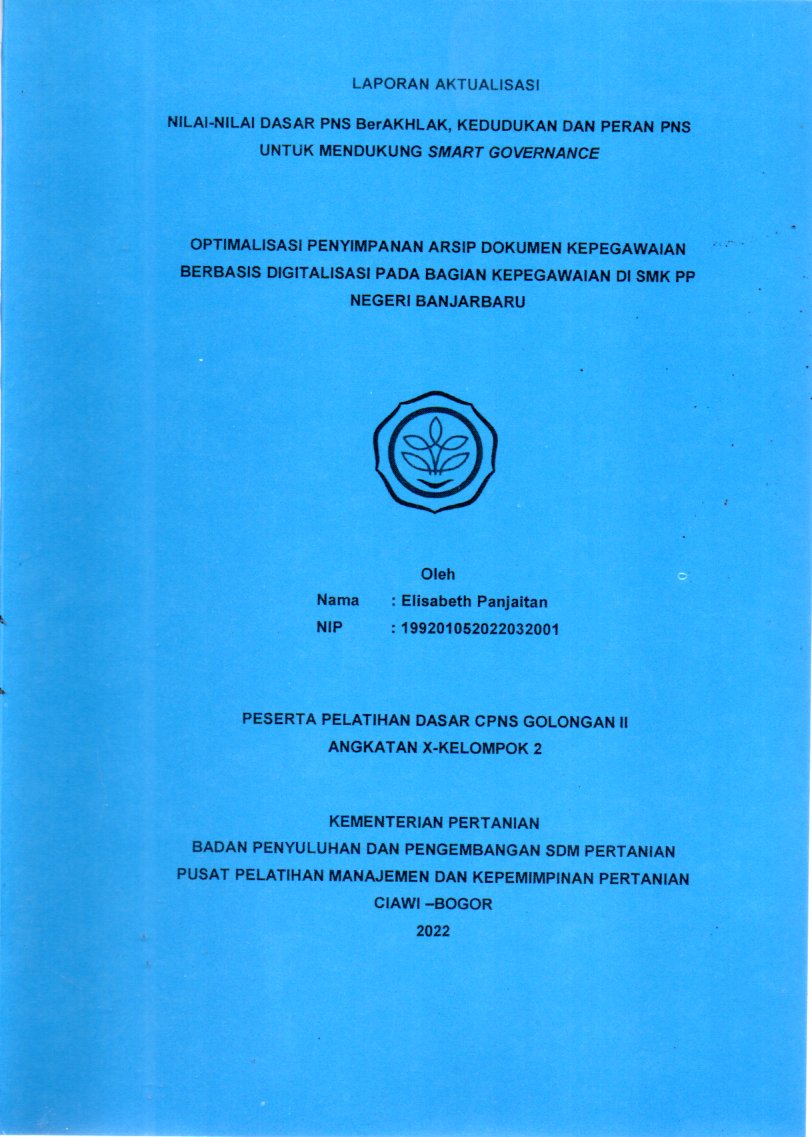 Pelatihan Dasar (Latsar) CPNS bertujuan untuk menanamkan nilai-nilai dasar ASN BerAKHLAK yaitu Berorientasi Pelayanan, Akuntabel, Kompeten, Harmonis, Loyal, Adaptif, dan Kolaboratif dalam setiap kegiatan aktualisasi di lingkungan kerja; serta mengimplementasikan kedudukan dan peran ASN untuk mendukung terwujudnya smart governance. Isu aktual yang dipilih penulis yaitu Masih lambatnya proses pencarian arsip kepegawaian di SMK PP Negeri Banjarbaru. Alternatif gagasan untuk pemecahan isu tersebut adalah dengan Optimalisasi Penyimpanan Arsip Dokumen Kepegawaian Berbasis Digitalisasi Pada Bagian Kepegawaian. Pemecahan isu dibagi kedalam 6 kegiatan dengan masing-masing 2 sampai 4 tahapan. Hasil kegiatan aktualisasi berupa Pembuatan Akun Google Drive Untuk Memudahkan Proses Pencarian Dokumen Kepegawaian di SMK PP Negeri Banjarbaru. Kegiatan ini berkontribusi terhadap visi SMK PP Negeri Banjarbaru yaitu terwujudnya Lembaga Pendidikan Pertanian yang handal untuk menghasilkan Sumber Daya Manusia Pertanian yang profesional, Mandiri dan Berdaya Saing.Dalam aktualisasi ini, nilai Akuntabel merupakan nilai yang dominan. Dengan diterapkannya aktualisasi ini diharapkan dapat memudahkan tim kepegawaian dalam melakukan pencarian dokumen atau pun data pekerjaan yang berhubungan dengan kegiatan kepegawaian yang ada di SMK PP Negeri Banjarbaru.