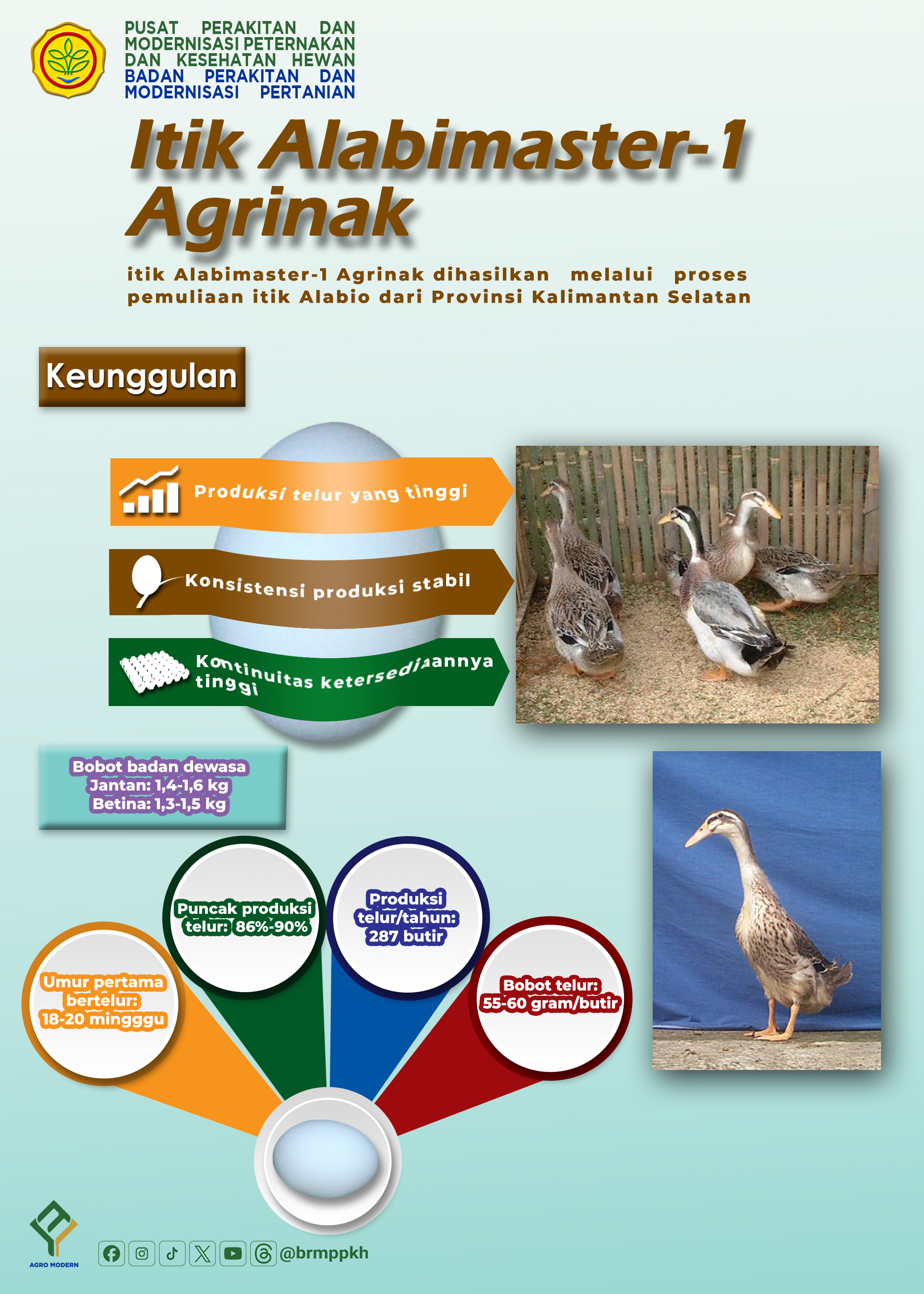 Itik Alabimaster-1 Agrinak adalah varietas itik unggul yang dihasilkan melalui proses pemuliaan itik Alabio dari Provinsi Kalimantan Selatan. Itik ini memiliki keunggulan utama berupa produksi telur yang tinggi, konsistensi produksi yang stabil, serta kontinuitas ketersediaan yang terjamin. Secara teknis, itik ini mulai bertelur pada umur 18–20 minggu dengan puncak produksi mencapai 86–90%, mampu menghasilkan hingga 287 butir telur per tahun dengan bobot telur 55–60 gram per butir. Bobot badan dewasanya berkisar antara 1,4–1,6 kg untuk jantan dan 1,3–1,5 kg untuk betina, menjadikannya pilihan unggul bagi para peternak yang menginginkan produktivitas tinggi dan hasil yang konsisten.