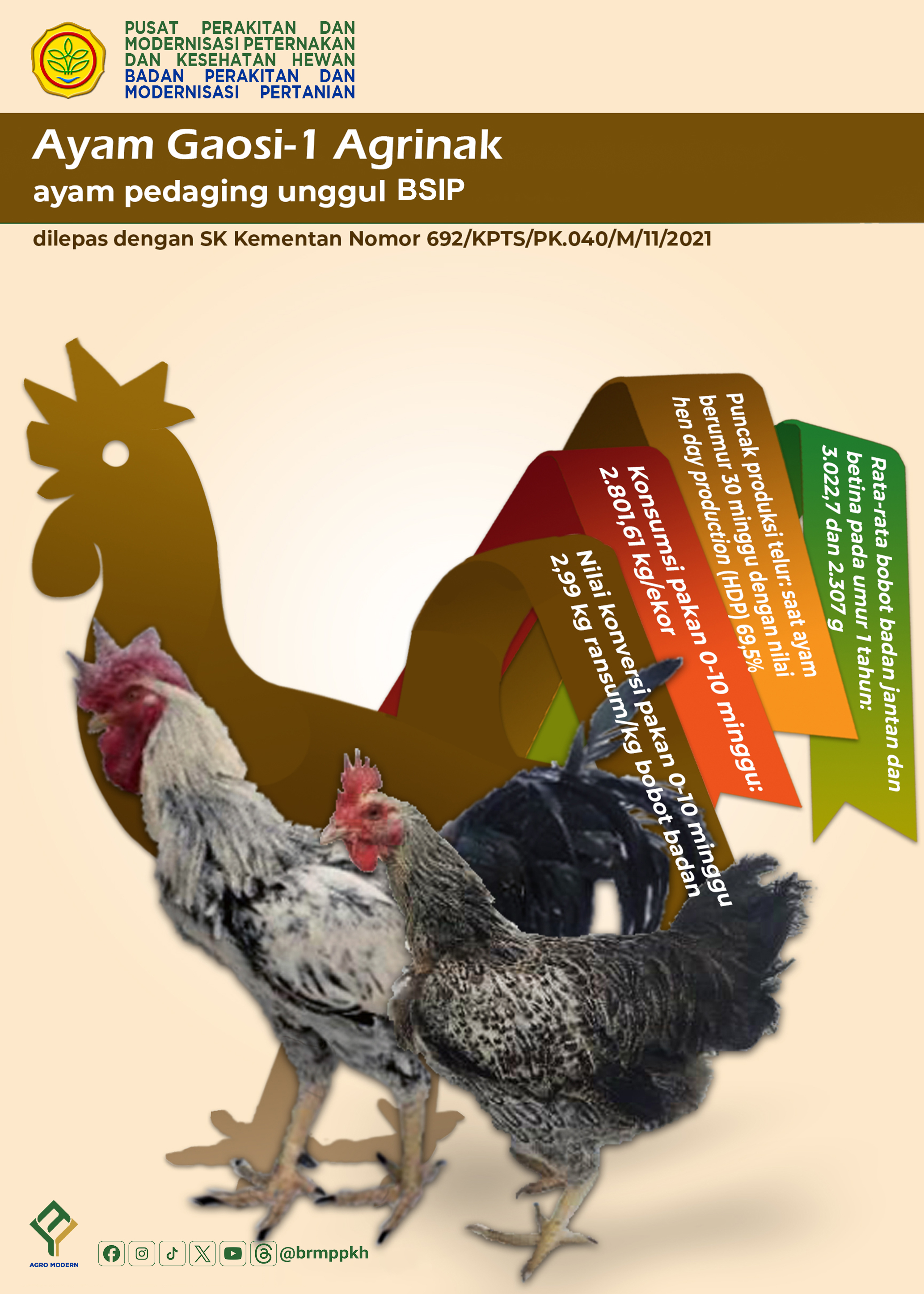 Ayam Gaosi-1 Agrinak merupakan salah satu inovasi unggulan di bidang peternakan dari BSIP. Ayam ini dirancang sebagai ayam pedaging dengan performa yang baik dan efisien. Keunggulannya antara lain memiliki pertumbuhan yang optimal, penggunaan pakan yang lebih hemat, serta potensi produksi telur yang cukup tinggi. Dengan performa tersebut, ayam ini dapat membantu meningkatkan produktivitas usaha peternakan. Selain itu, Ayam Gaosi-1 Agrinak juga telah resmi dilepas oleh Kementerian Pertanian, sehingga kualitas dan pengembangannya sudah teruji.
