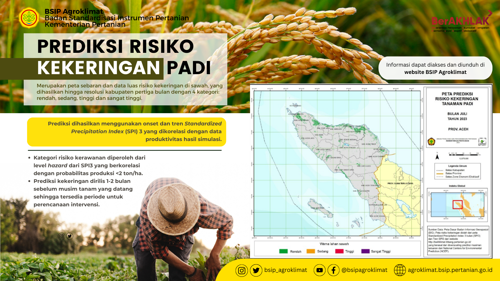 Prediksi Risiko Kekeringan Padi Merupakan peta sebaran dan data luas risiko kekeringan di sawah, yang dihasilkan hingga resolusi kabupaten pertiga bulan dengan 4 kategori: rendah, sedang, tinggi dan sangat tinggi.