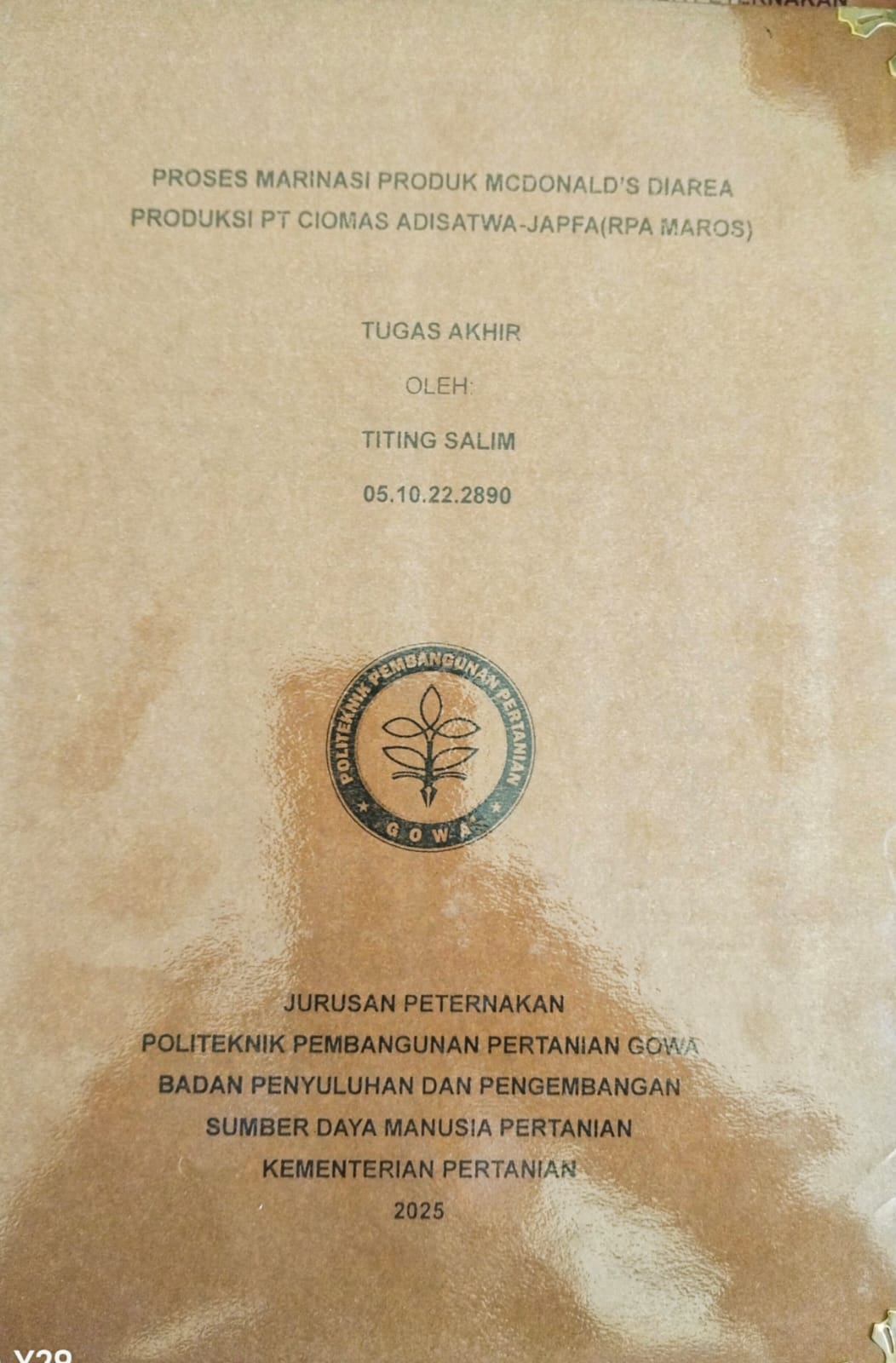 Proses Marinasi merupakan tahap penting dalam menghasilkan ayam siap saji dalam rasa dan mutu yang konsisten. Kegiatan ini dilakukan melalui magangdi area clean PT. Ciomas Adisatwa Unit Maros. mencakup pemotongan ayam, penembangan, pencampuran bumbu McD Reguler dan McD Hot, perendaman engan tumbler vakum selama 20 menit pengemasan , vakum sealing, pemeriksaan metal detector, dan penyimpanan sesuai standar. Marinasi juga meningkatkan kelembutan daging dan daya simpan produk. Kendala yang ditemukan yaitu takaran bumbu yang tidak konsisten akibat proses manual dan kurangnya pengawasan. Solusi yang diajukan antara lain pembauatan panduan kerja visual, peningkatan pengawasan QC, dan pengunaan timer otomatis. Tugas Akhir ini memperkaya pemahaman mahasiswa terkait mutu, sanitasi dan keamanan pangan di industri olahan ternak berskala global.